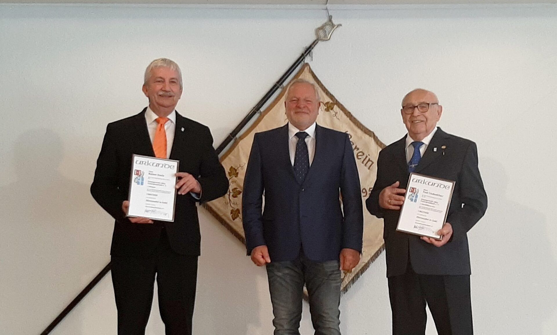 Eine weitere besondere Ehrung führte Zimmermann für den Chorverband Bruchsal durch. Er zeichnete Schriftführer Paul Lindenfelser für 20 Jahre Verwaltungstätigkeit und Dirigent Rainer Kneis für 20 Jahre Chorleitertätigkeit beim GV 1864 aus. Bild 3